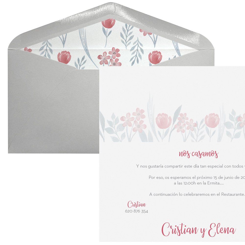 Una sutil invitación de boda de tonos claros y con estampado de flores y tulipanes. Sencilla y elegante.
